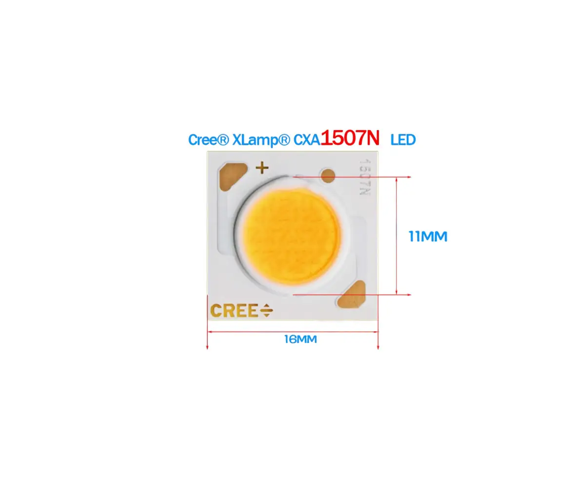 CREE 1507N оснащений LED-матрицею діаметром 11 мм, розміщеною на компактній підкладці 16×16 мм, що забезпечує ефективний тепловідвід і дозволяє інтегрувати діод у широкий спектр світлотехнічних рішень. Робоча напруга 36 В у поєднанні з номінальним струмом 200–350 мА гарантує стабільну роботу, відсутність мерехтіння та оптимальну яскравість при мінімальному енергоспоживанні.